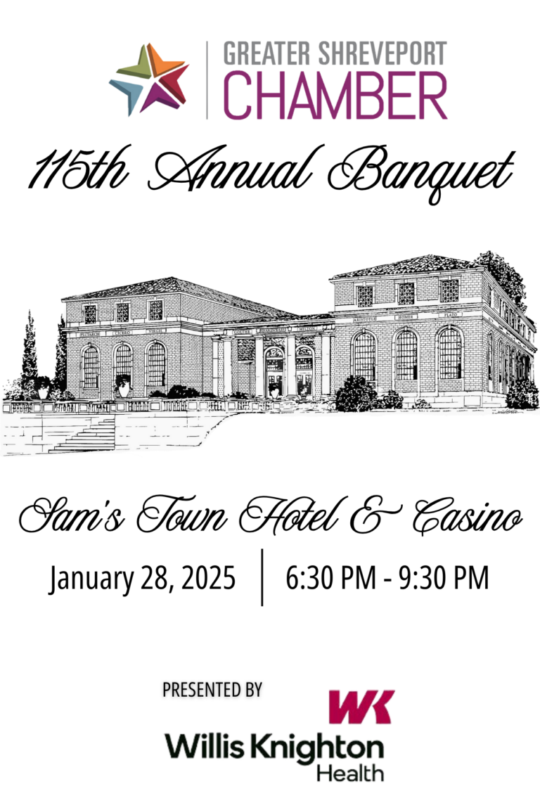 The Greater Shreveport Chamber of Commerce will host its 115th Annual Banquet on Tuesday, January 28, 2025, at Sam’s Town Casino & Hotel from 6:00 PM to 9:30 PM. This annual event, presented by Willis-Knighton Health System, celebrates the achievements of the local business community, honors outstanding leaders, and looks ahead to the year’s opportunities.