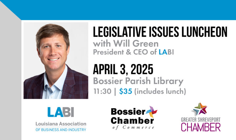 BOSSIER CITY, LA – The Bossier Chamber of Commerce and the Greater Shreveport Chamber of Commerce are partnering to host a Legislative Issues Luncheon featuring Will Green, President/CEO of the Louisiana Association of Business and Industry (LABI). The event will take place on April 3 at the Bossier Parish Central Library and will focus on key legislative priorities for the upcoming session.