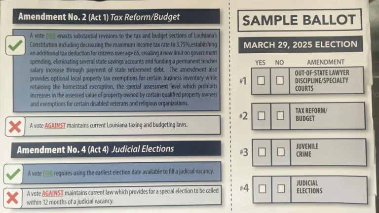 (The Center Square) — Louisiana voters overwhelmingly rejected four proposed constitutional amendments which aimed to reshape the state’s approach to justice, juvenile crime, taxation, and judicial elections. Each amendment was rejected by more than 60% of voters.