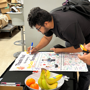 Gaither interacted with students and faculty Monday on the first day of classes to spread further awareness of these resources. He stood at a booth that included open education resource facts and a huge “Thank You” card signed by LSUS students.