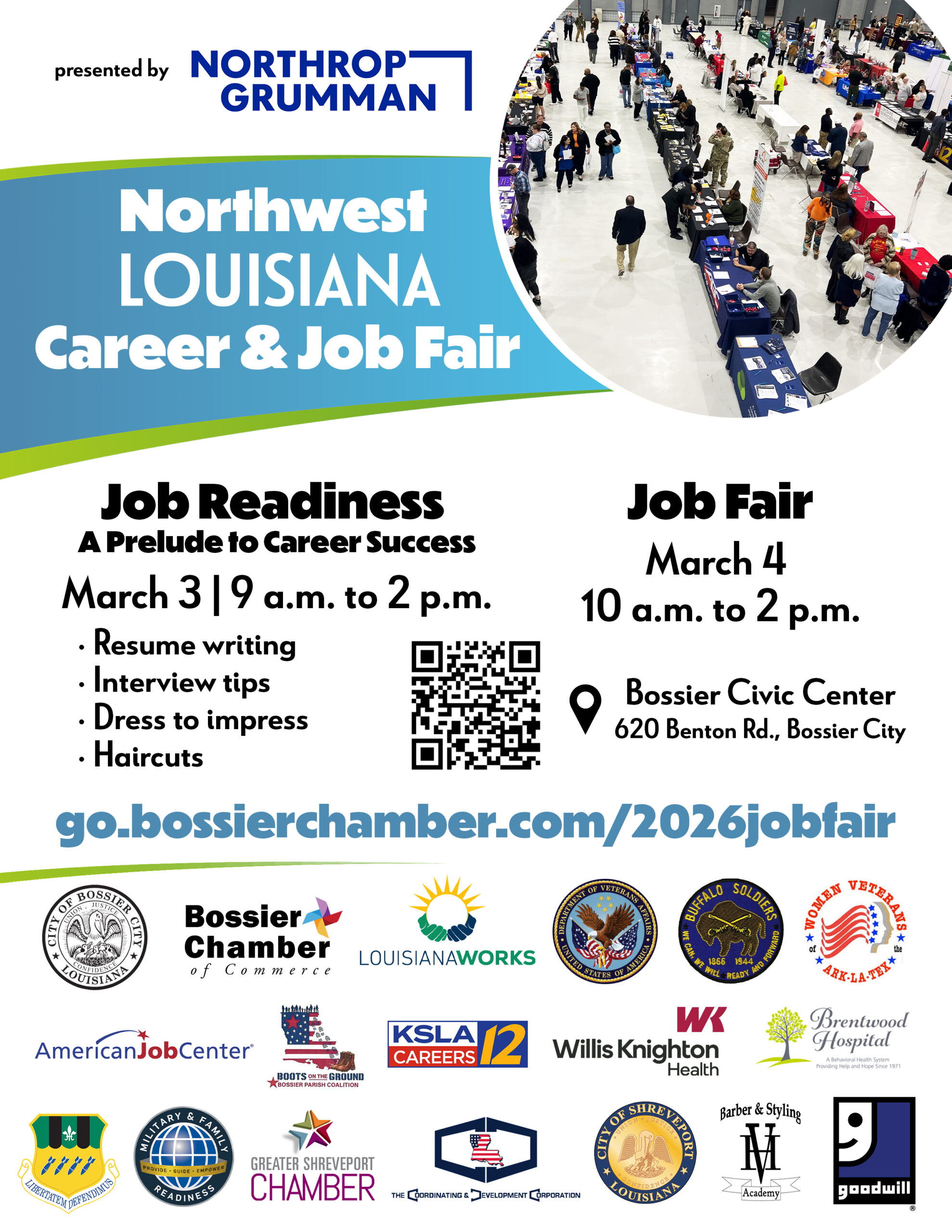 The event is presented by Northrop Grumman and organized by the Bossier Chamber in partnership with Louisiana Works. Supporting partners include the City of Bossier City; the U.S. Department of Veterans Affairs; the American Job Center; Barksdale Air Force Base; the Barksdale Air Force Base 2nd Bomb Wing; the Greater Shreveport Chamber of Commerce; the City of Shreveport; CHRISTUS Health; Brentwood Hospital; and Willis Knighton Health, among others.