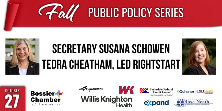 The Bossier Chamber’s Public Policy Series is designed to connect members with policymakers and experts at the state and federal levels. The program provides updates on government initiatives, policy shifts, and public spending priorities affecting Louisiana residents and businesses.