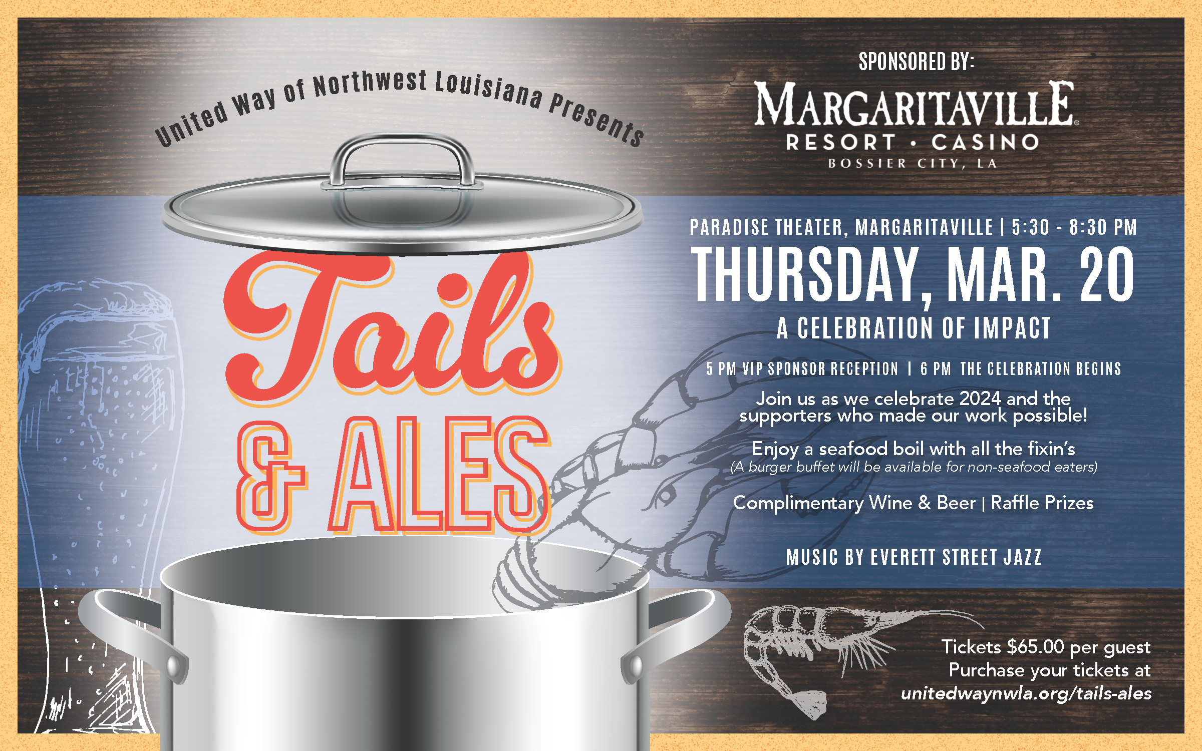 SHREVEPORT, La. – United Way of Northwest Louisiana (UWNWLA) is set to host Tails & Ales: A Celebration of Impact on March 20 at the Paradise Theater inside Margaritaville Resort Casino Bossier City. Presented by Margaritaville Resort Casino, the event will recognize top supporters, share UWNWLA’s 2024 fundraising and impact results, and celebrate with an evening of food, music, and awards.